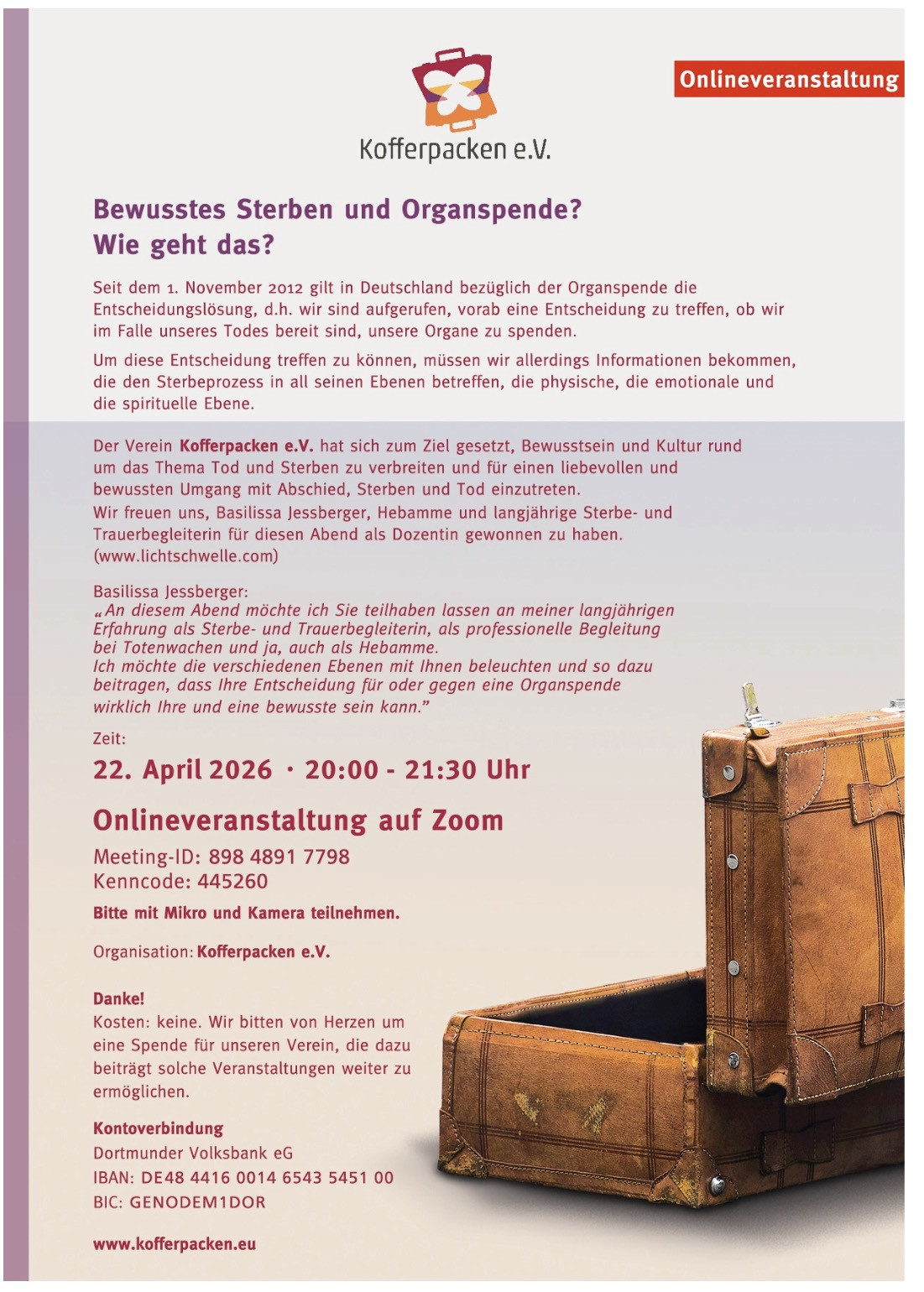 Der Verein Kofferpacken e.V. möchte das Thema Tod aus der Tabu-Ecke holen und sich für einen bewussten, liebevollen Umgang mit Sterben, Tod und Abschied einsetzen.